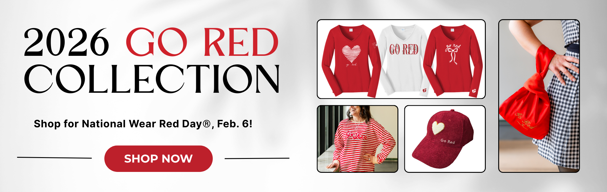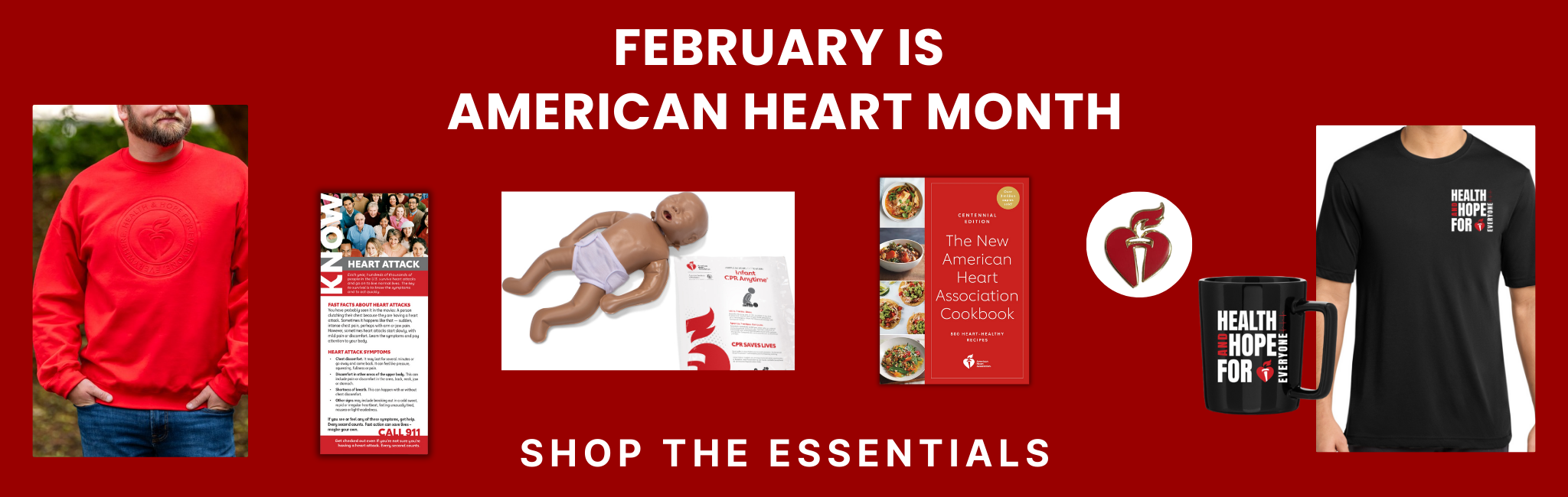 AHA heart and torch logo pin with cut out torch, red dress pin on card, red dress crystal brooch in velvet box