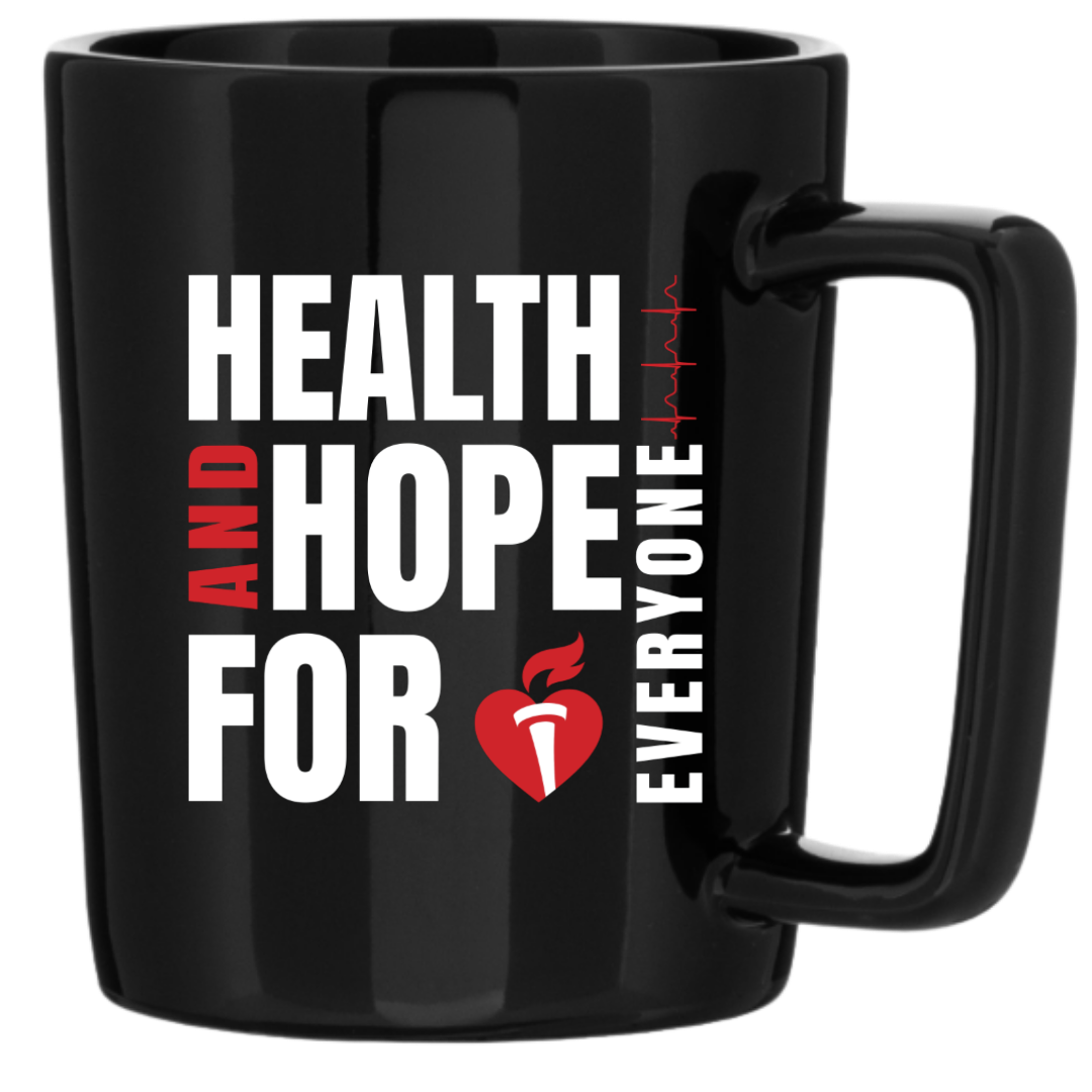 Start your day with a dose of inspiration. Our Health & Hope for Everyone. Everywhere. ceramic mug celebrates the American Heart Association’s vision for healthier lives everywhere. Featuring a sleek, glossy finish inside and out, it’s perfect for home or office —and a simple way to share the mission with every sip. Check out our matching Health & Hope Athletic tee too!