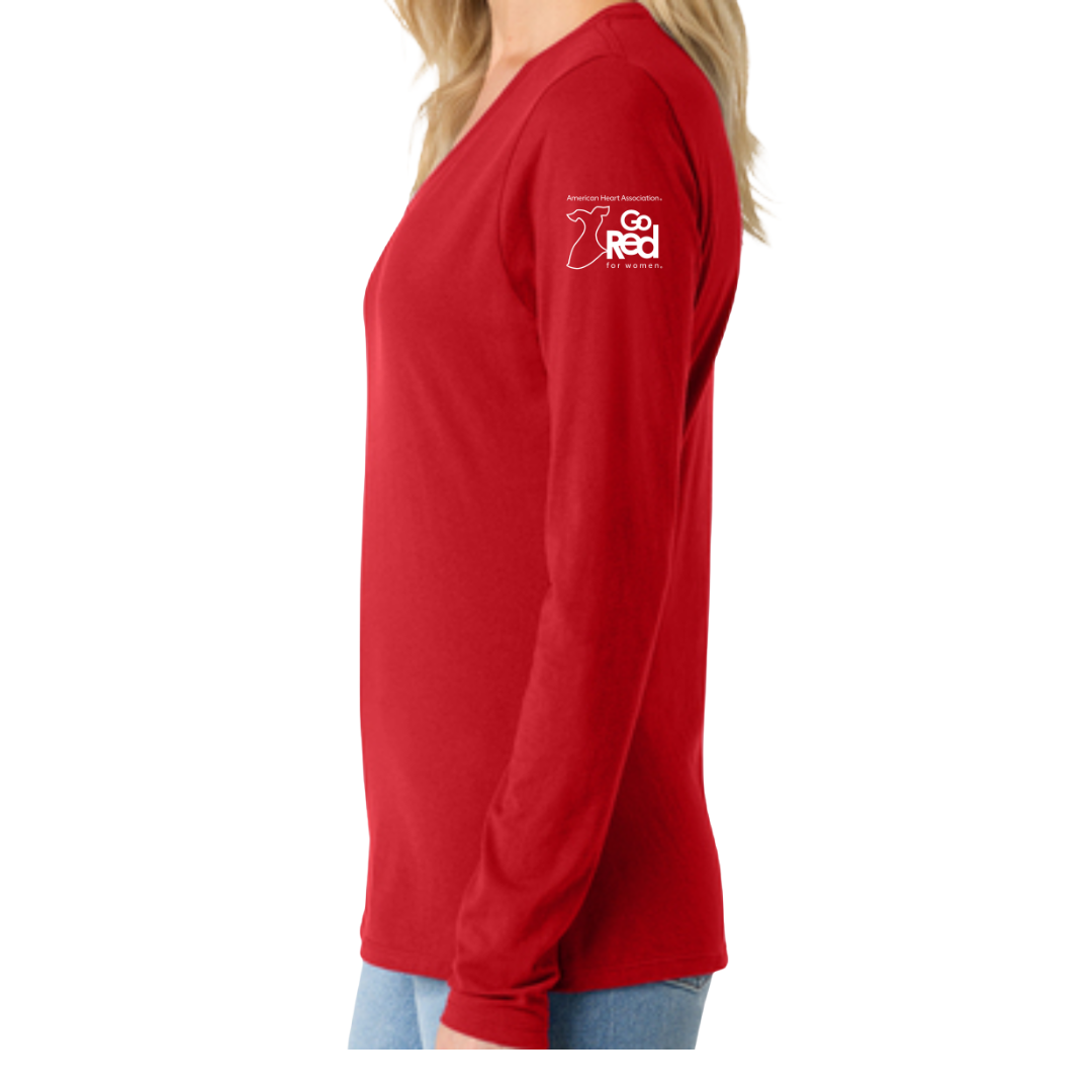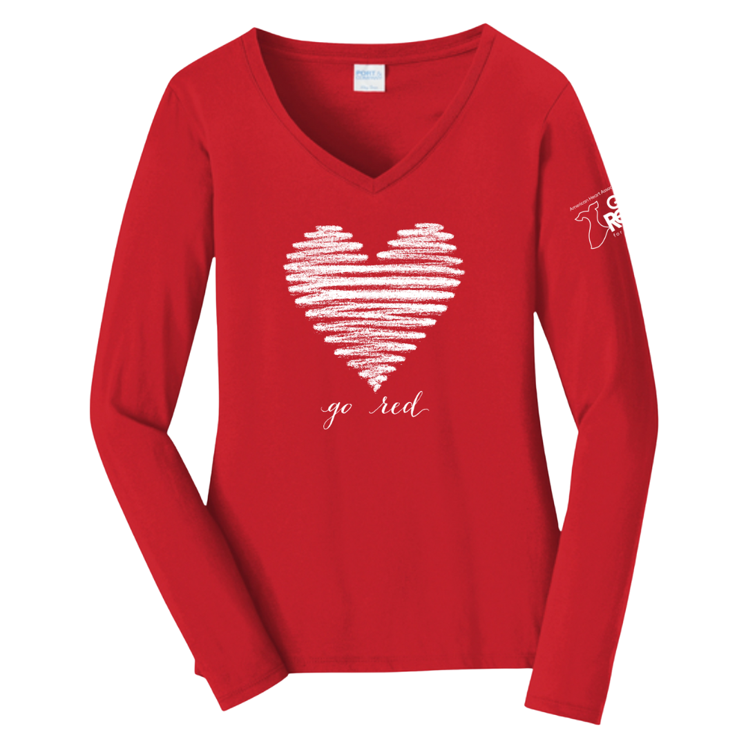Our Go Red Sketch Heart long sleeve V-neck tee features a simple heart design that pairs easily with any outfit. Made from comfortable ringspun cotton with a ladies fashion fit that tapers closer to the body. Recommend sizing up if you prefer a less fitted look. Please refer to the size chart in images for best fit.