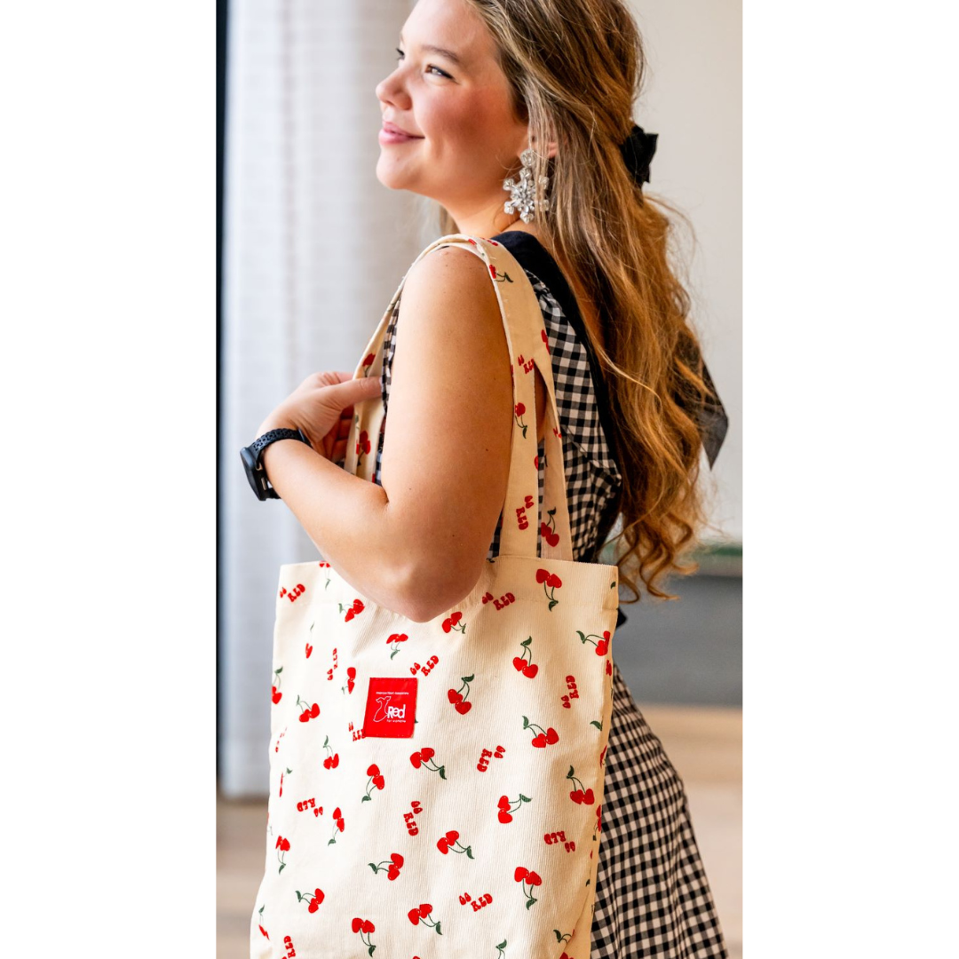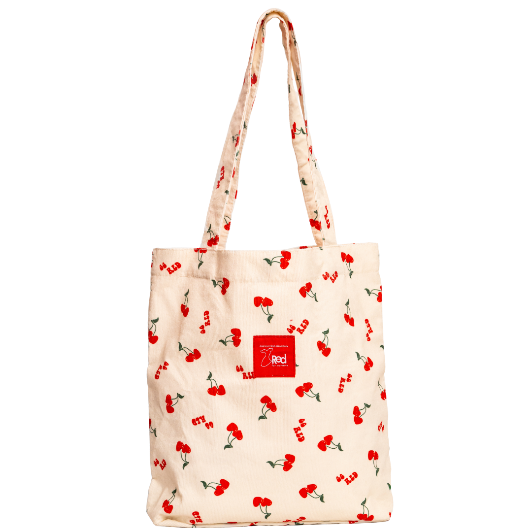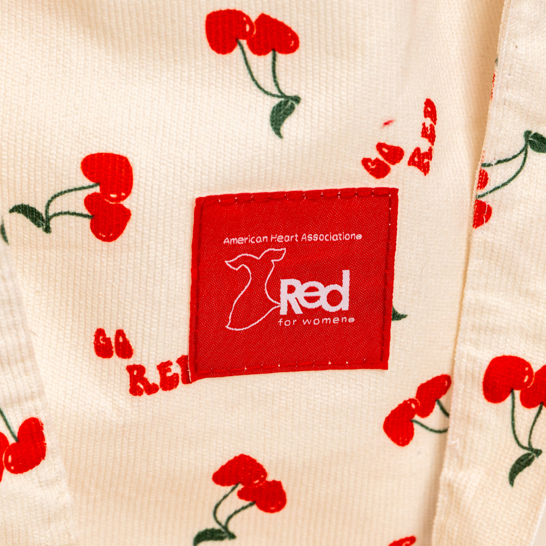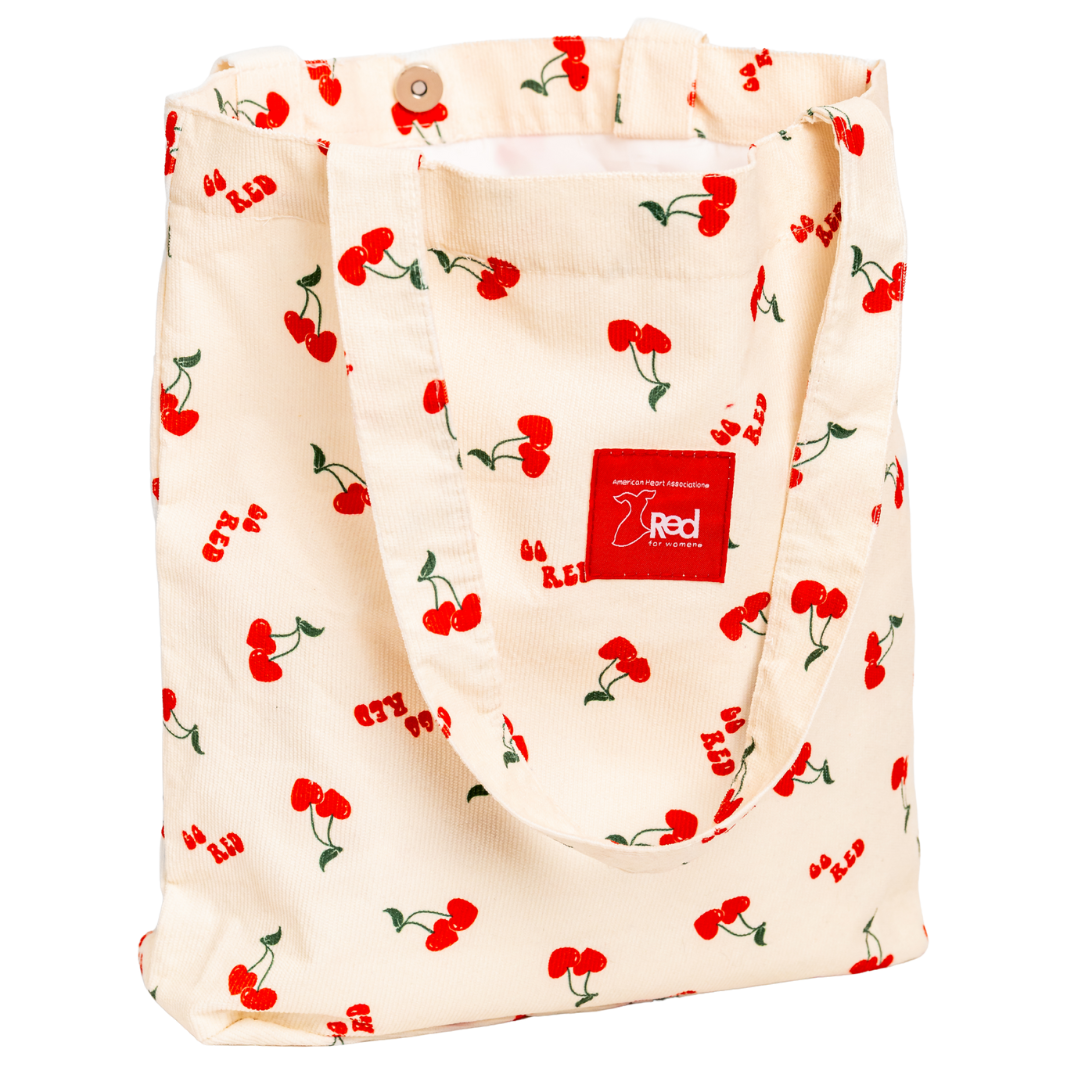 A playful take on everyday carry, this custom corduroy tote features a scattered heart-shaped cherry pattern and a bold Go Red logo patch for a statement that’s both fun and functional. Lined with coordinating satin-like fabric and a magnetic snap closure, the interior offers plenty of room to keep daily essentials secure while two convenient pockets keep small items organized and easy to find.