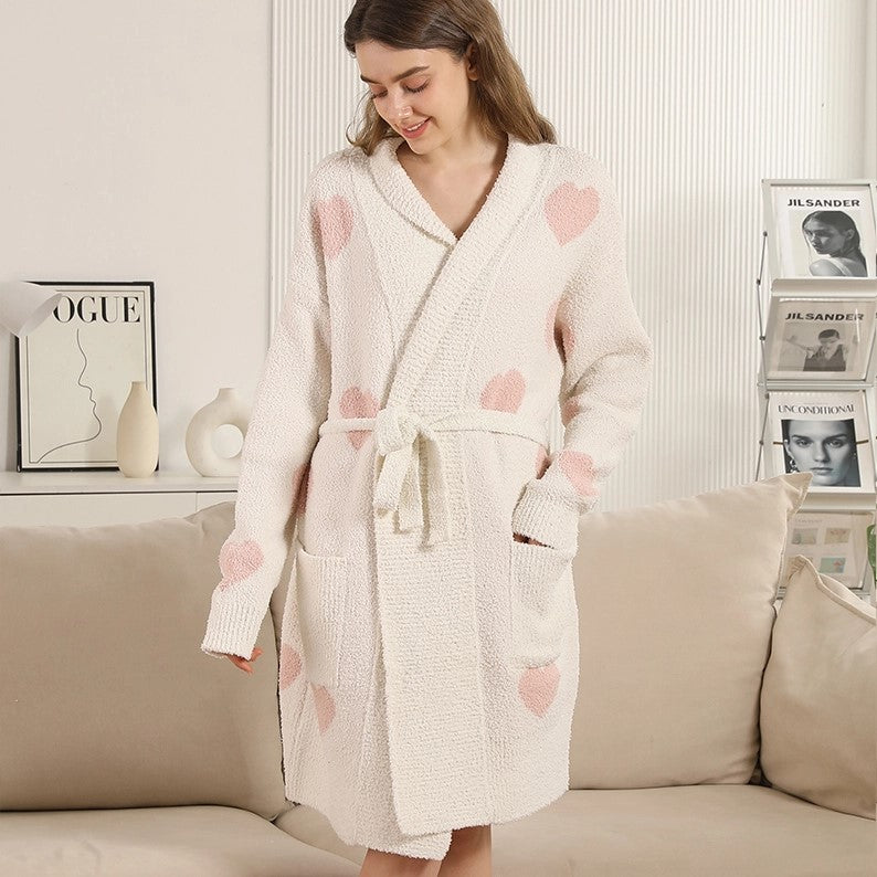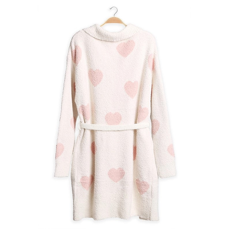 Wrap yourself in heart-warming comfort with this cozy patterned robe. Made from ultra-soft textured knit, it’s perfect for lounging in style. A neutral base sprinkled with charming hearts, a self-tie belt for a custom fit, and two roomy pockets make it as practical as it is plush. Treat yourself or gift someone special.