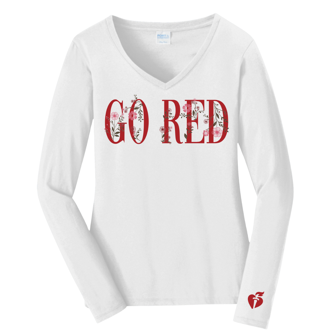 Go Red in our Garden Party long sleeve V-neck tee, made with soft ringspun cotton for all day comfort. Bold “Go Red” lettering is paired with delicate floral accents, creating a look that’s both striking and graceful. The ladies fashion fit makes the shirt taper in to fit the body more closely. Size up if a looser fit is preferred. Please refer to the size chart in images for best fit.
