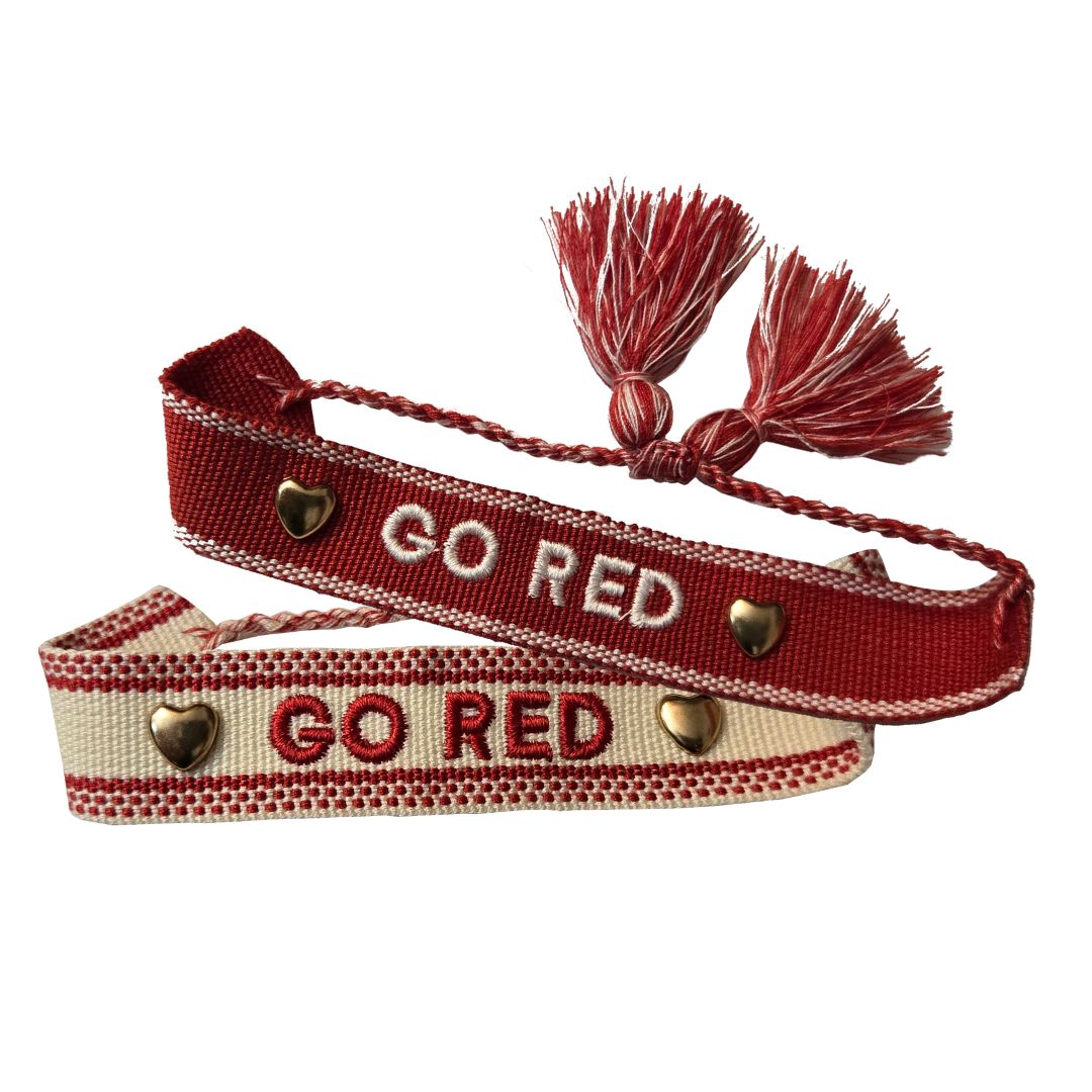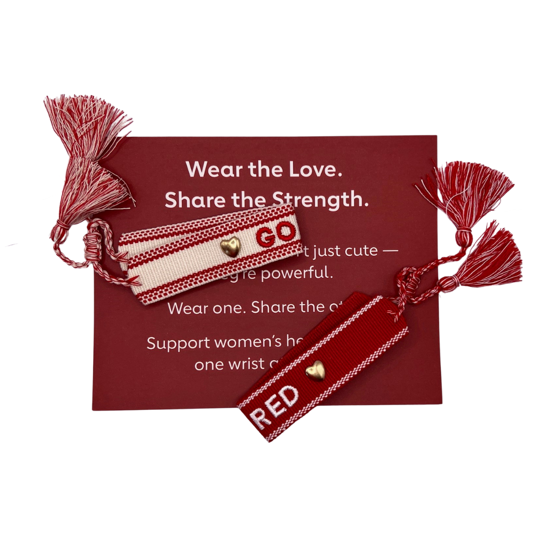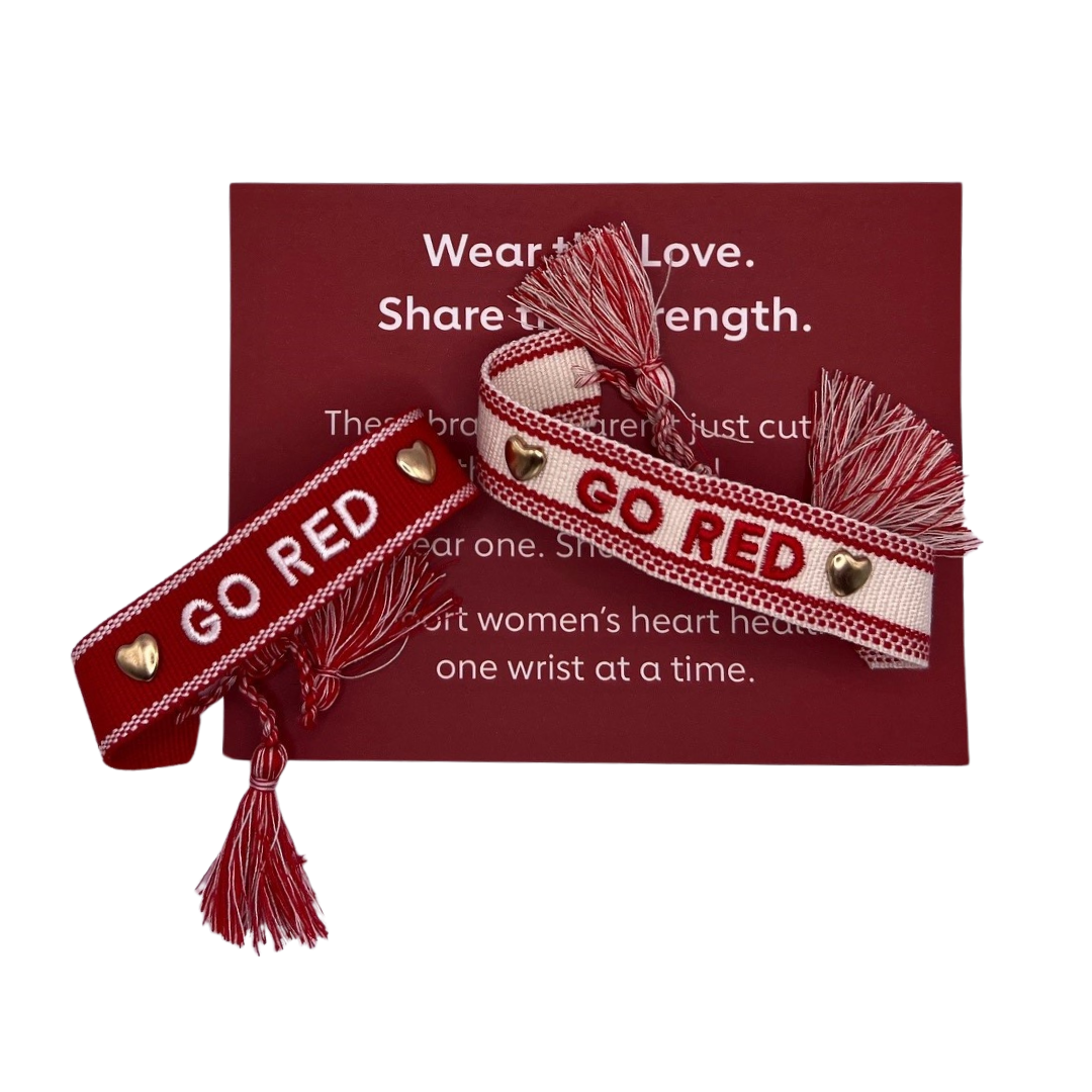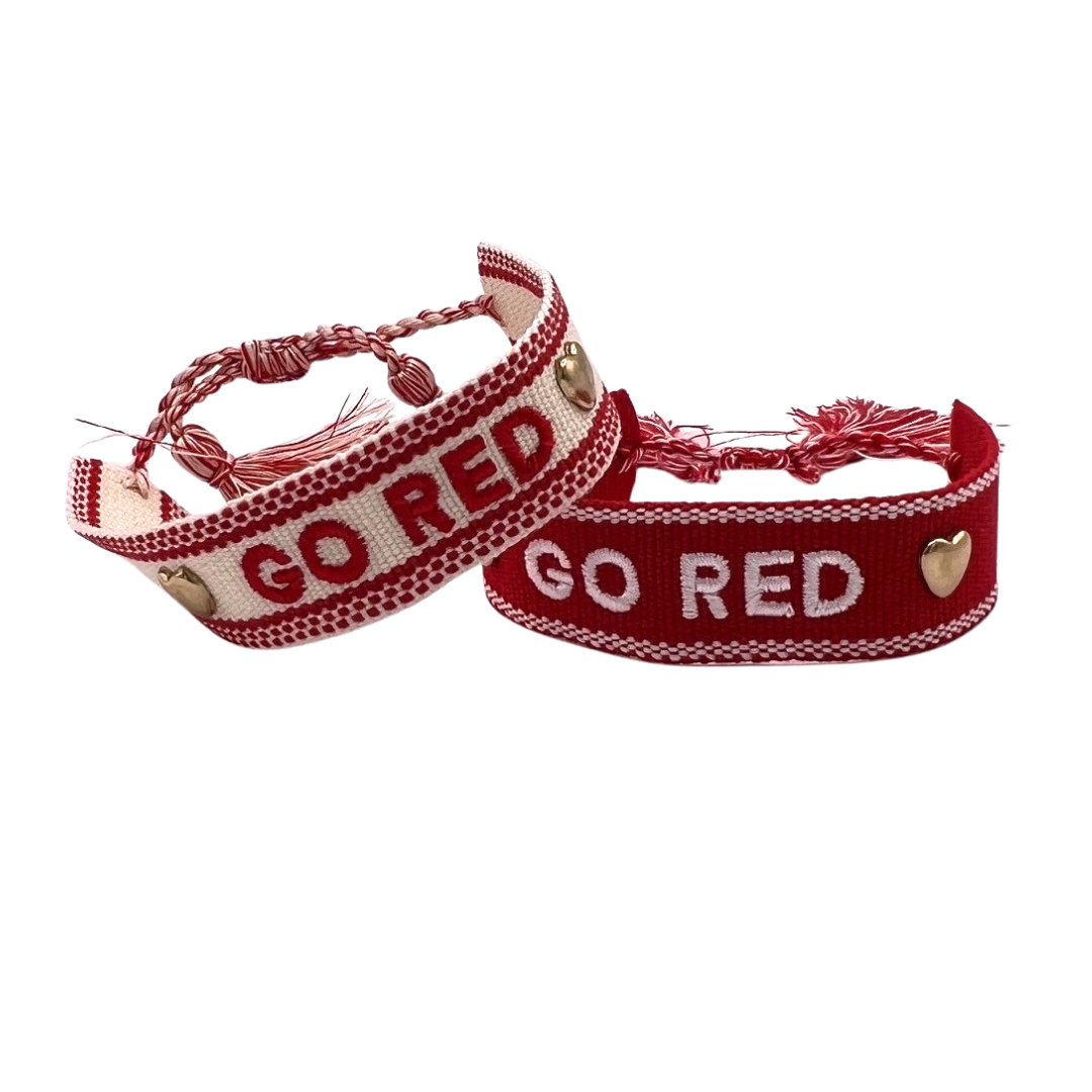 Pick up a pack of our trendy Go Red woven bracelets! These chic wristbands feature the embroidered GO RED message and are accented with little metal hearts for a touch of shine. Finished with playful red-and-white tassels, each adjustable bracelet adds effortless style. Every pack includes two colors—classic red and soft off-white—perfect for mixing, matching, or sharing with a bestie!