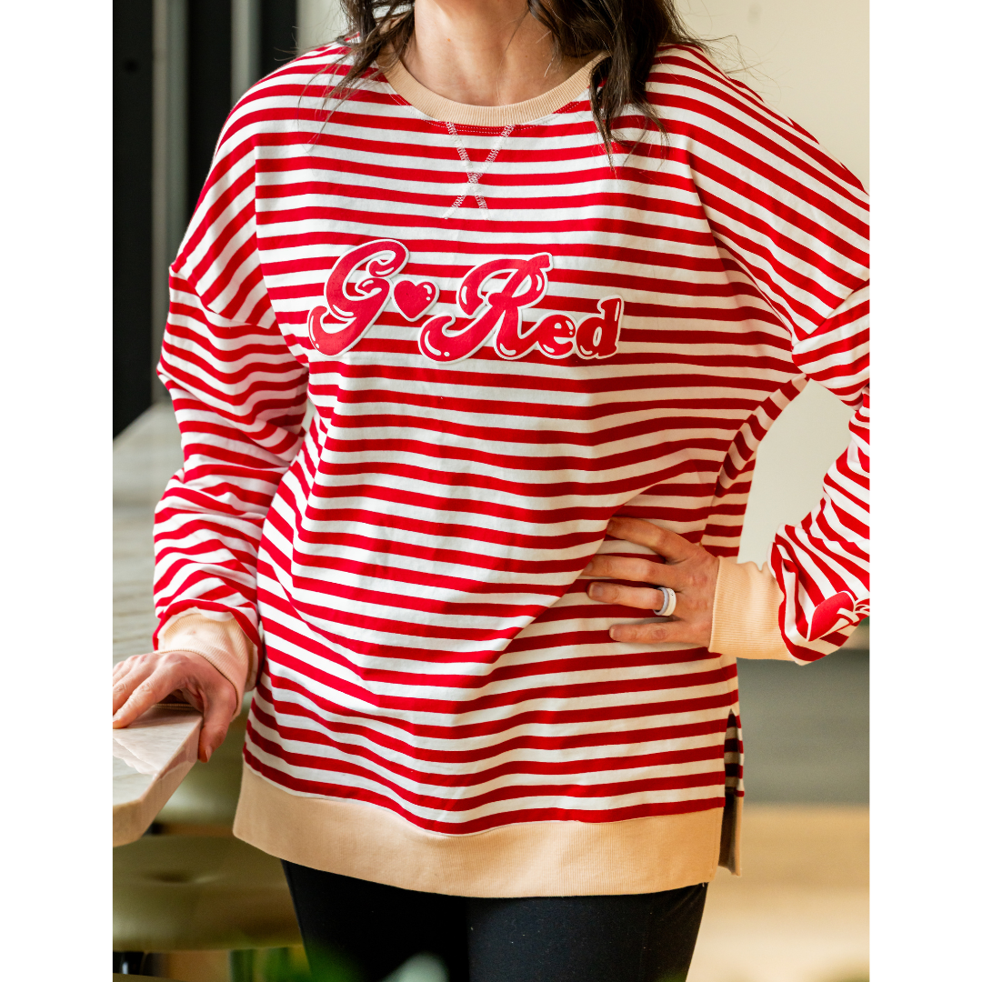 One of the season’s hottest looks goes RED! This striped pullover features Go Red in a fun puff print across the chest and the American Heart Association’s iconic heart and torch logo on the sleeve. Lightweight with an oversized, comfy fit, it’s perfect for pairing with jeans, leggings, or even shorts.